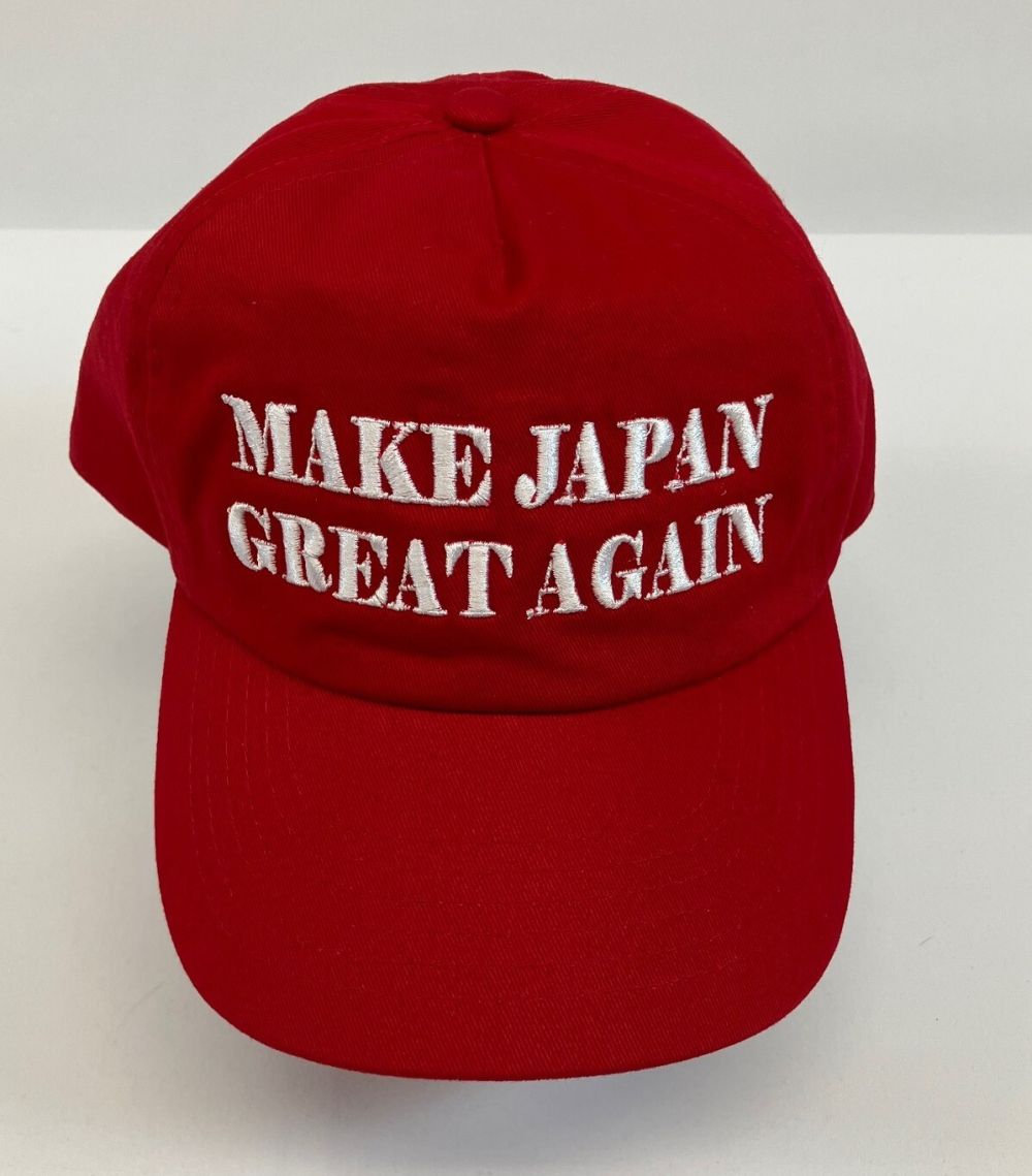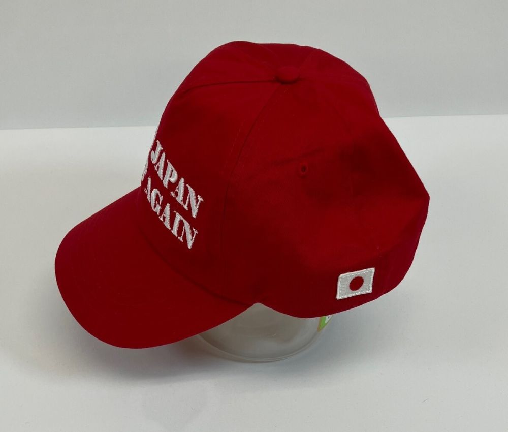 品物は、赤色帽子に前面「MAKE JAPAN GREAT AGAIN」の白色の刺繍、左側頭部に日本国旗のワッペン旗、後側に店名の白色の刺繍が施されています。