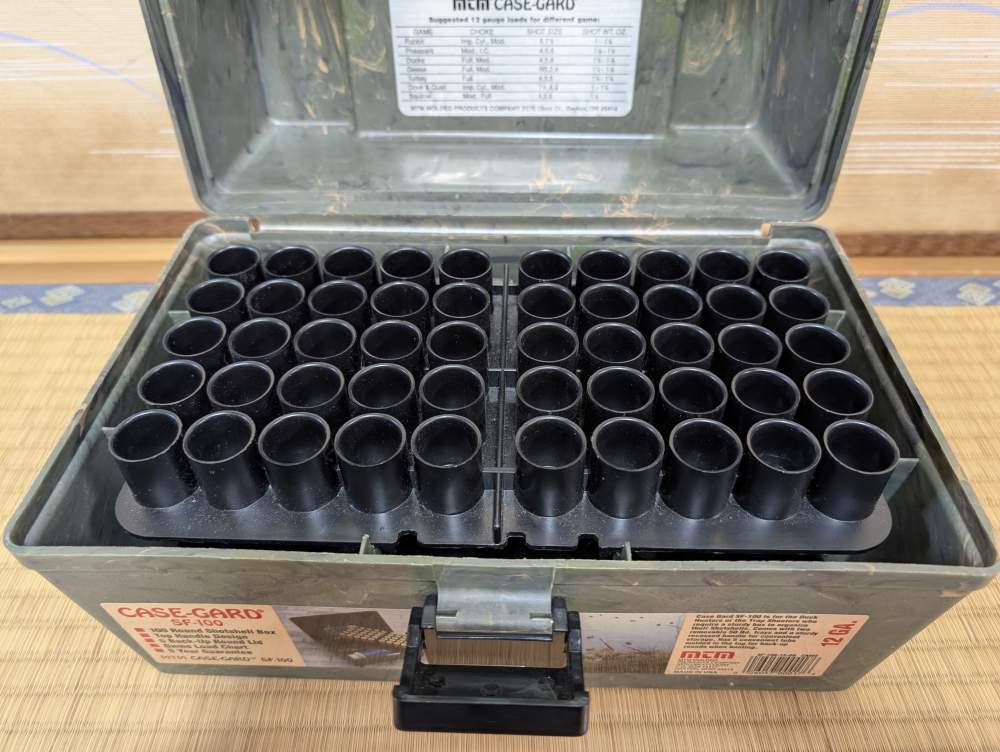 12番 ショットシェル(散弾)を2段に50+50個 計100個収納し、持ち運びすることが出来るMTMの12GA ショットシェルケースです。 |