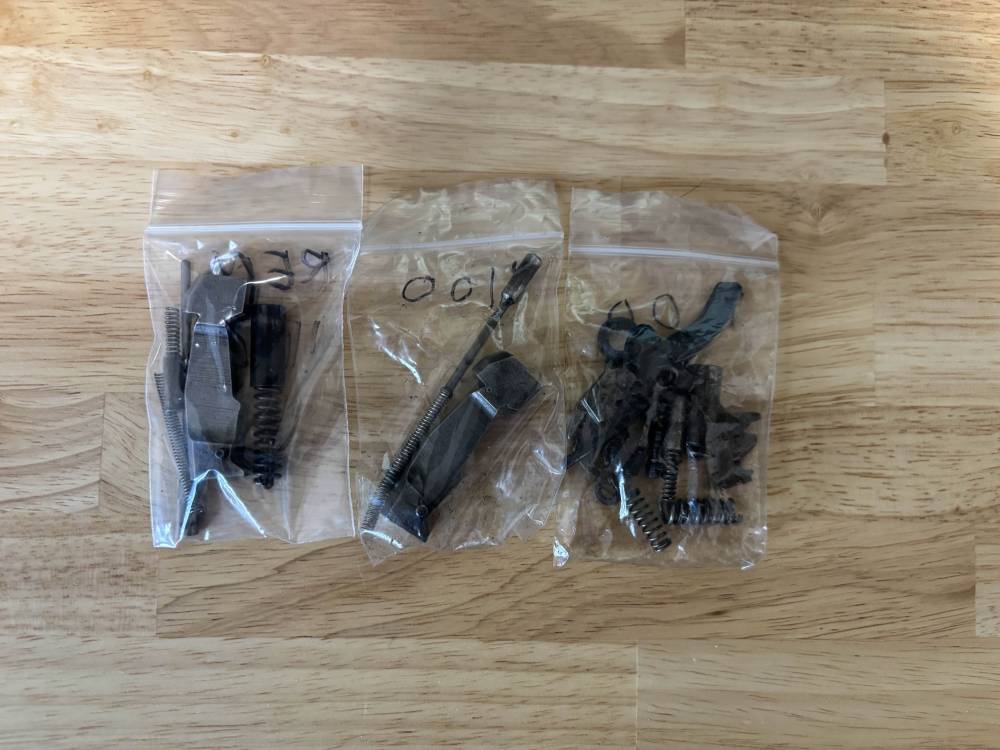 中古のレミントン1100(12ゲージ)、2丁から取り外した部品類です。 |