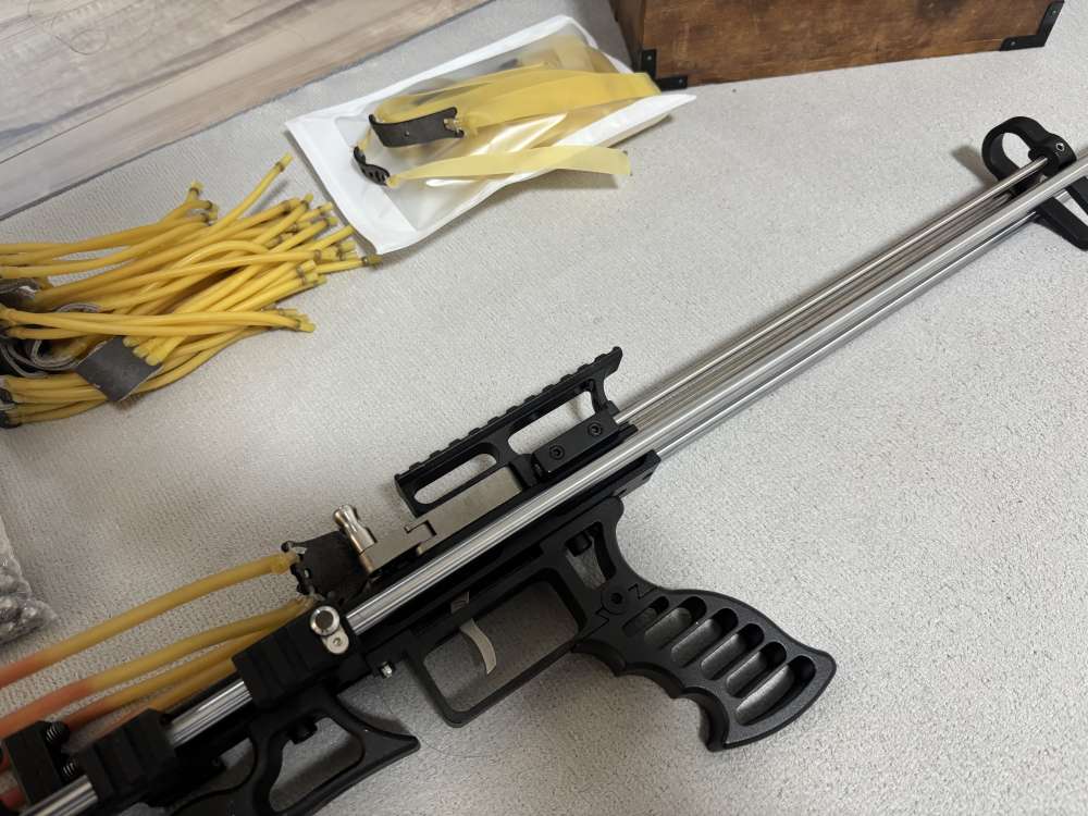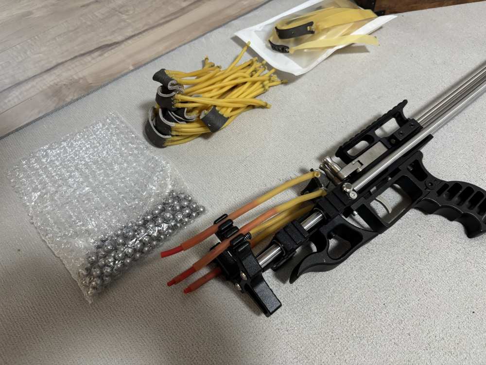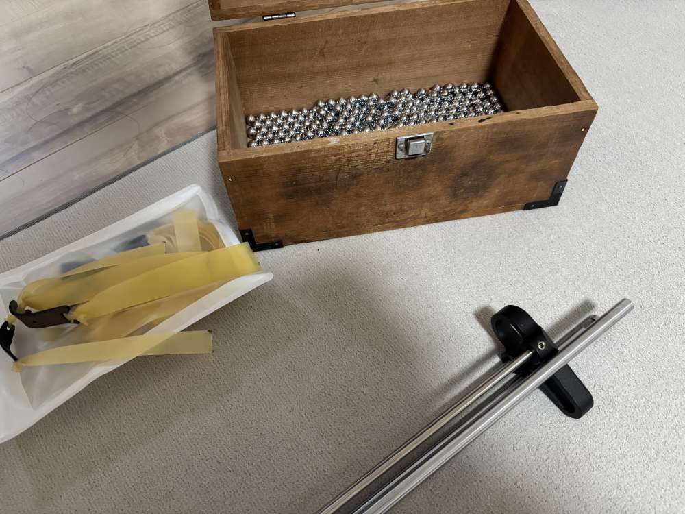 アリエクにて購入しましたが、一度的当てに使用しただけです。 内容は本体とパチンコ玉11mm400発くらい?と、9mm?が70発くらい?、替えのスリング数本をおつけします。 写真の木箱は付きません、宜しくお願いします。 送料は着払いになります。