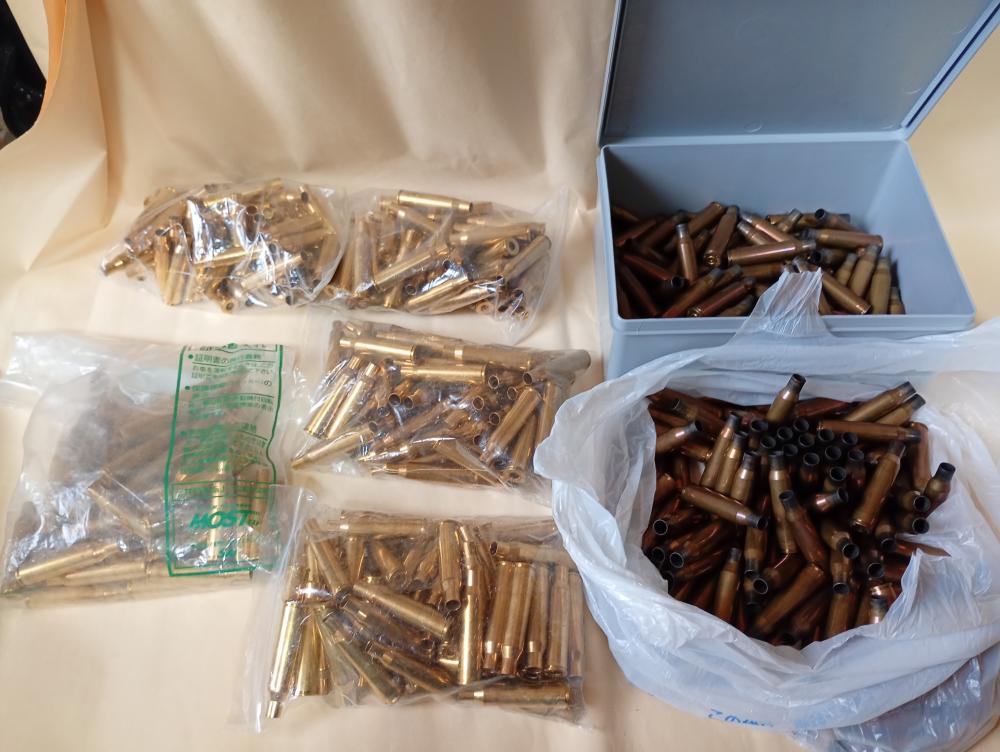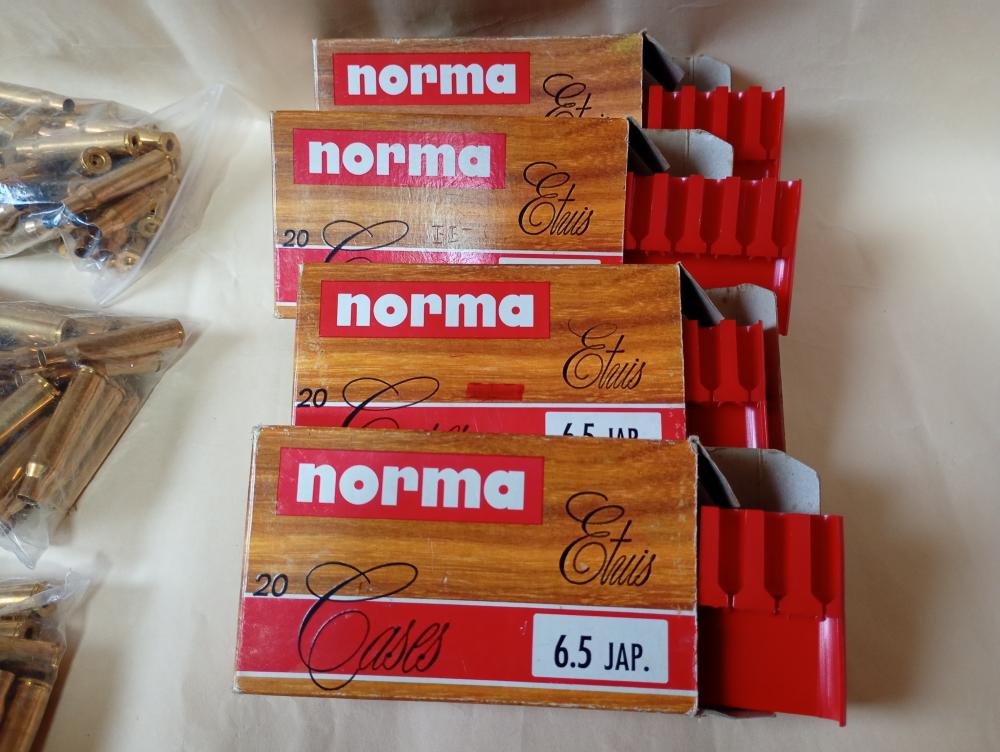 ノルマ社製6.5アリサカ薬莢 新品250本(内30本はネックバリ取り済)。オマケ中古薬莢(約15回使用)200本(内100本は使用済雷管付)。御希望の方は写真2枚目のケース(4個)を同梱します。 |