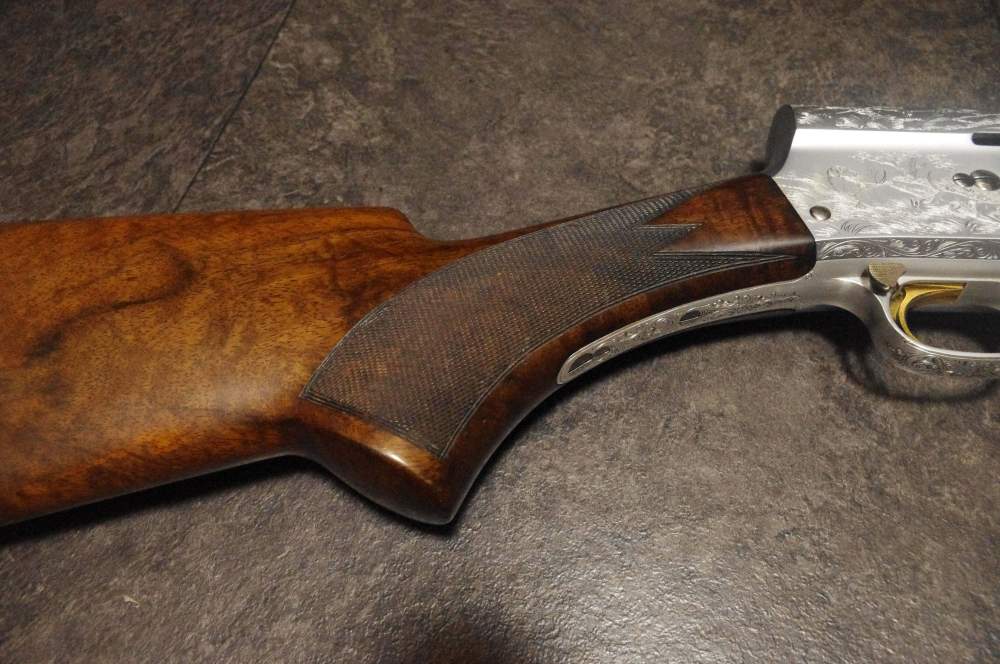 本品は Browning オーダーメイドモデル A.MARECHAL による手彫りフルシーン彫刻が施された極希少な自動銃です。左右全面にわたる細密な動物シーンと背景描写、そして職人本人のサインが刻まれた、世界に一丁級の工芸作品となります。