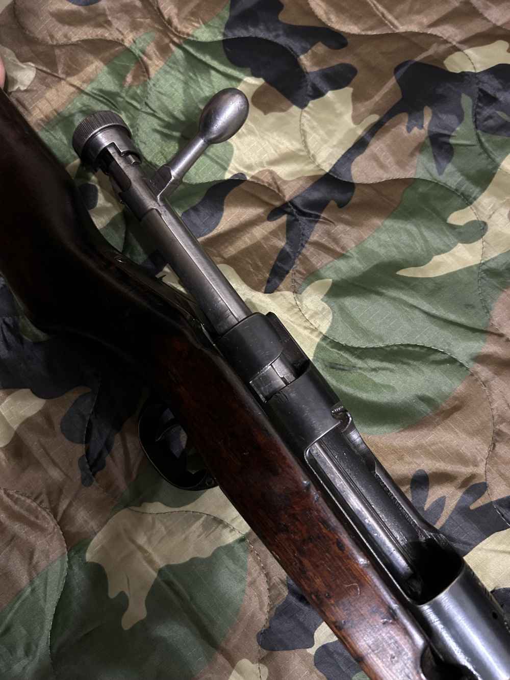 無可動銃の三八式歩兵銃ダミーカート付です。 旧加工より以前に輸入したものでボルトとトリガーが動きます。 銃身は溶接で閉鎖してあり、スリットは銃床内にあるため目立ちません。 菊の紋も飾られておらず残っております。