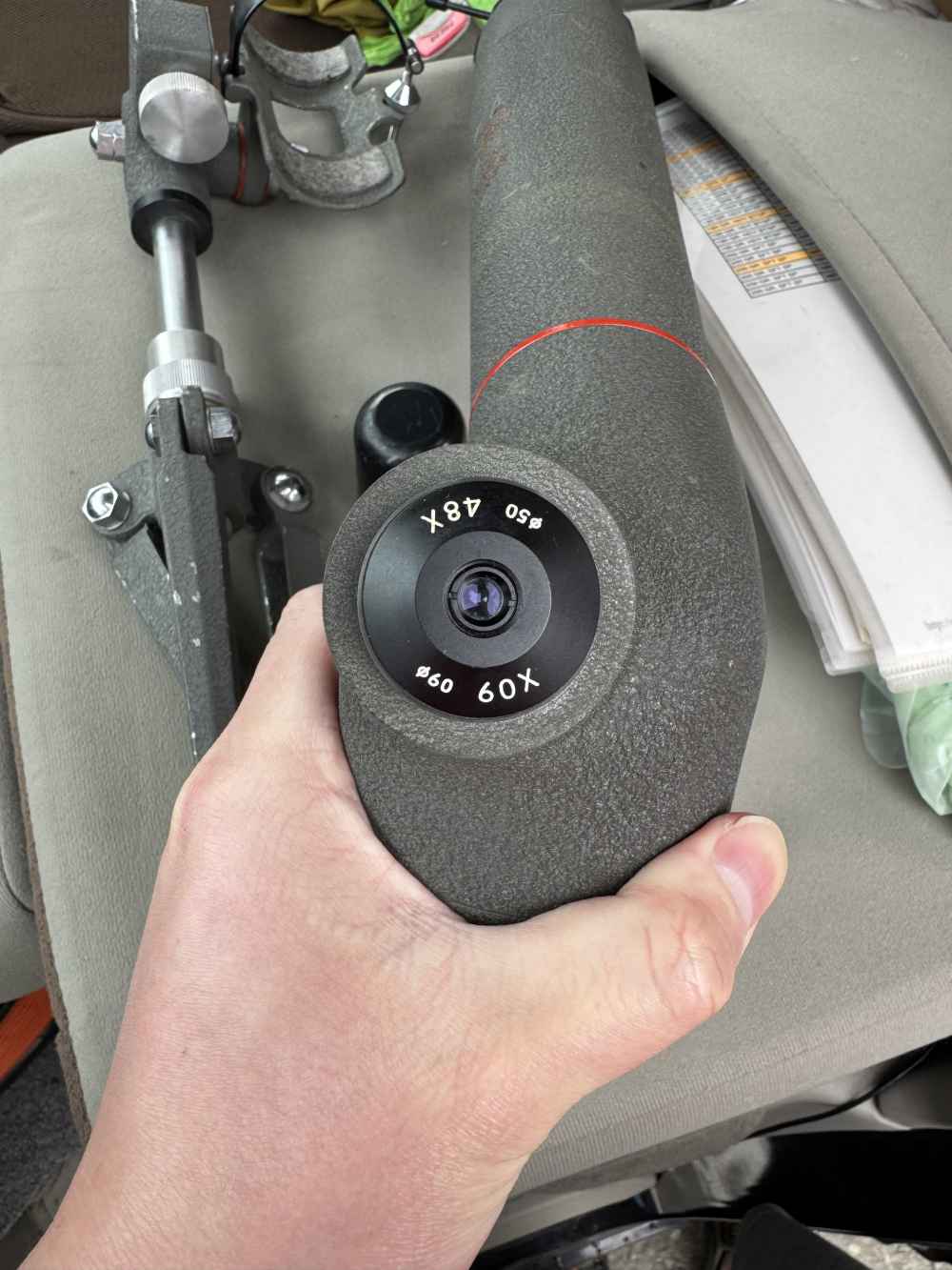 代理出品です。 専用の脚立と収納袋も付いております。 スコープのボディ部分に前所有者の名前が記載されています。