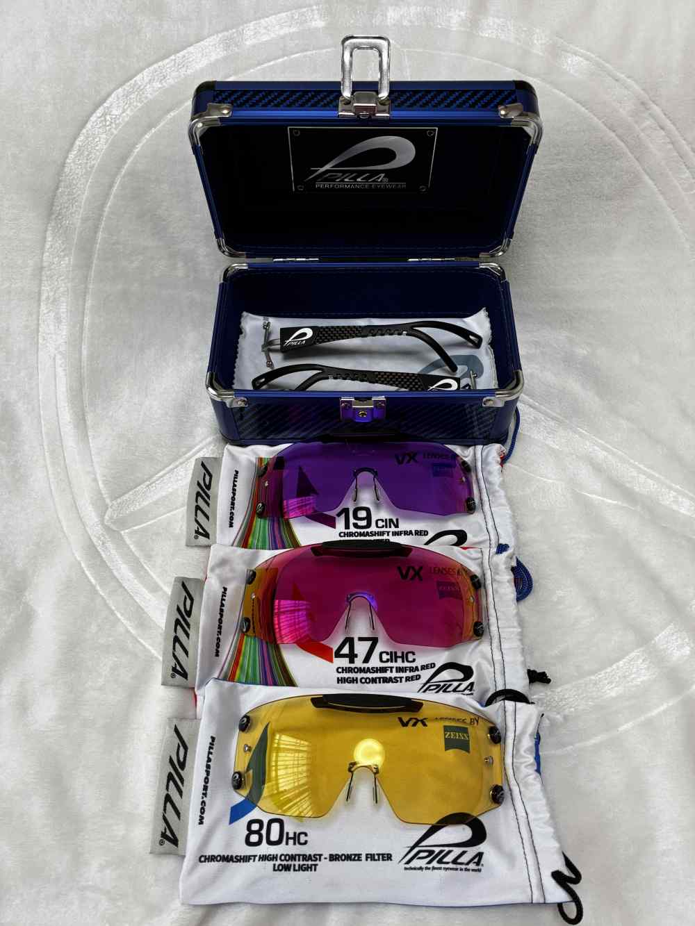 PILLA Outlaw X6 フレームと レンズ3枚 19CIN(バーミリオン濃) 47CIHC(バーミリオン) 80HC(イエロー) ケース+レンズクロスのセットになります。 約3年トラップ射撃で使用してきました。使用に伴う小傷が少し有りますが射撃に影響するようなキズはありません! よろしくお願いします。