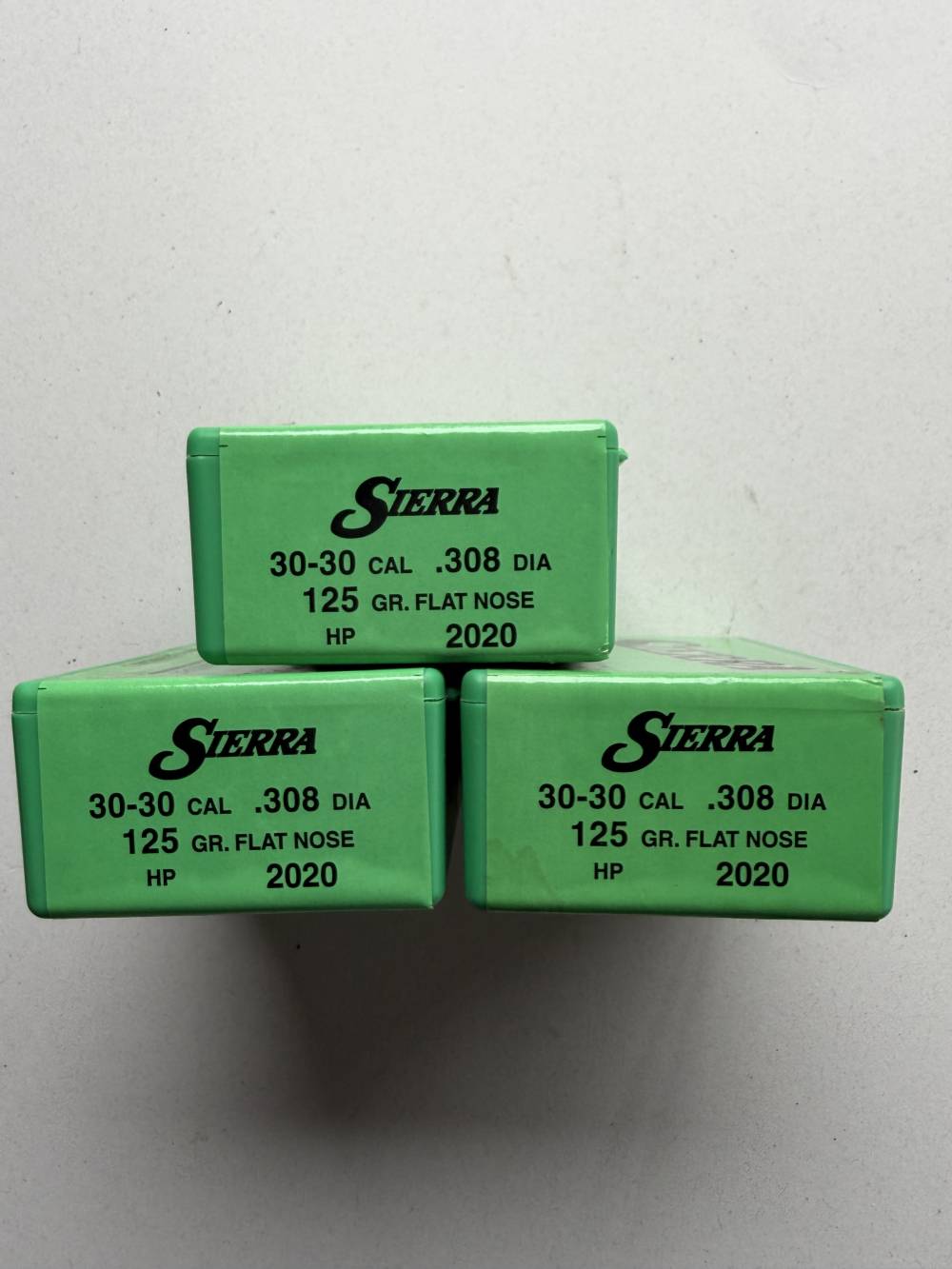 シェラ製125grHP弾頭 30-30レバーアクション用 他308口径射撃練習用にも使用可 先端がフラットでホローポイントのタイプです。新品未開封3箱有り。1箱5500円で3箱まとめて購入希望 |