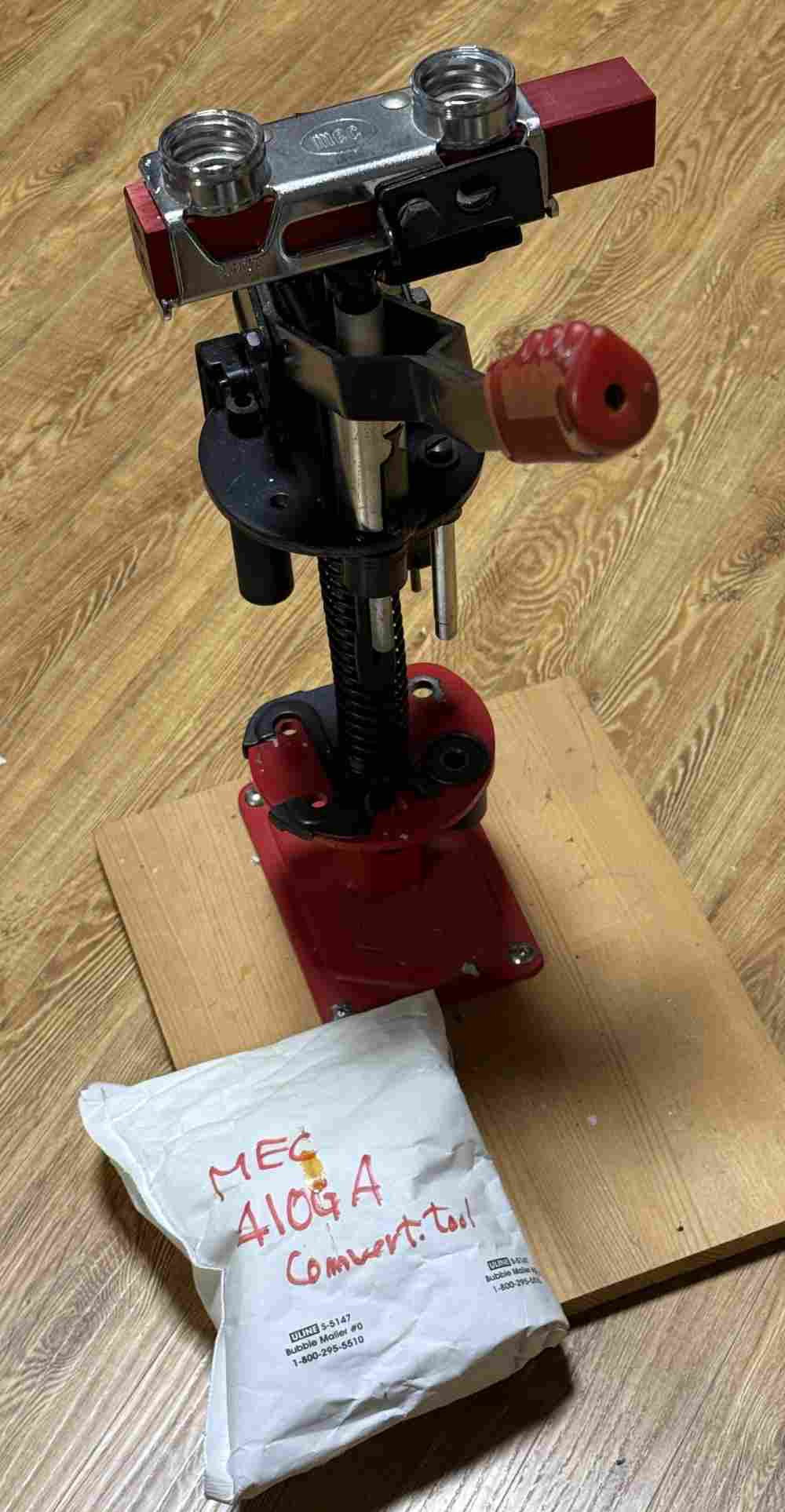 MEC 600 Jr. Reloading Press 410 番 コンバージョンのキットです。 使用しようと思い購入致しましたが、使用致しませんでした。 410番のキットですので組み立ては必要かと思います。 恐らく、12、20番のキットで替える事も出来るのではないかと思います(確約は出来ませんが) 下の板は含みません、もしご希望でしたら同梱致します。