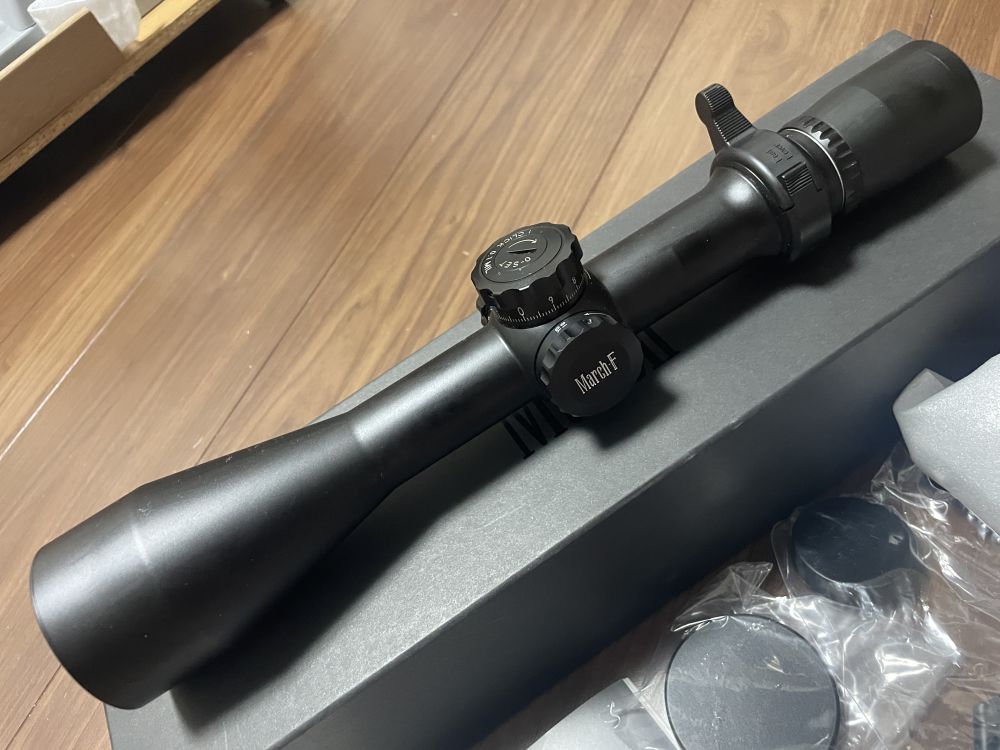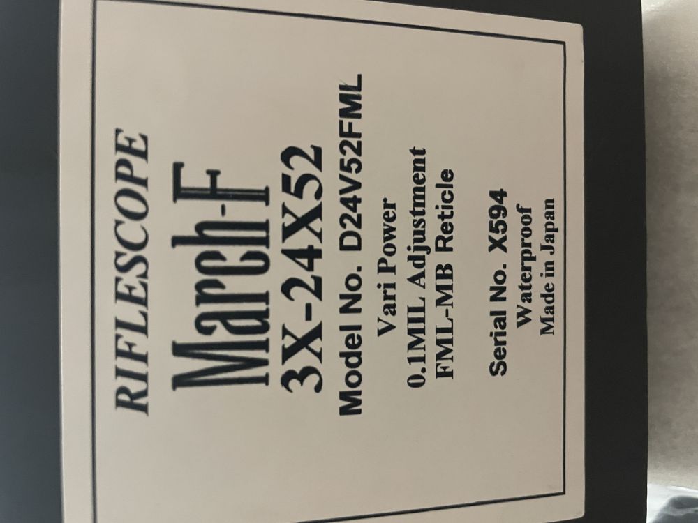 March -F 3-24倍 対物レンズ52ミリ。モデル名D24V52FML、レチクルはFML-MBミルドットです。エアライフルに付けて射場で数回使っただけの美品です。購入時付属した物は全て有ります。マーチは購入時、納期が長いのですぐに欲しい方、どうぞ。送料は負担します。 |